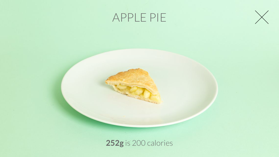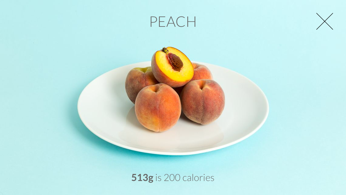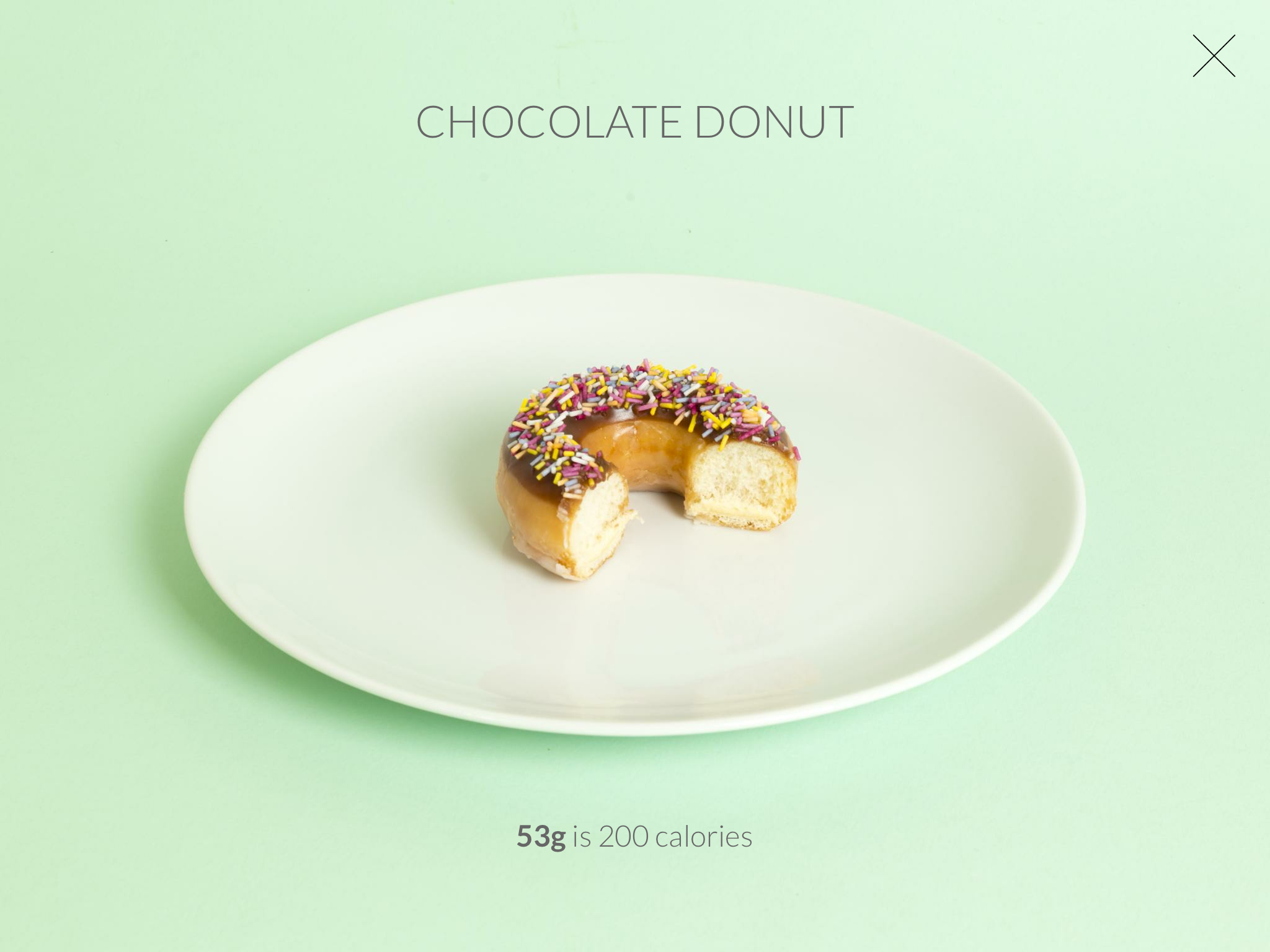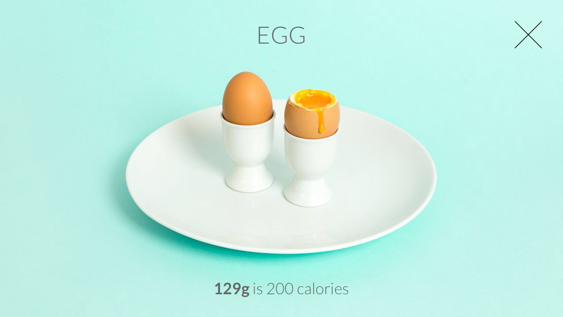 Developed by Nic Mulvaney and Tim Diacon in London, UK. After a big trip to the supermarket, Nic & Tim meticulously weighed, styled and photographed 144 different foods and drinks over two days. The results were a comprehensive insight into the calories that we consume and a suprising look at how each food compares. Of course, calories are not the only thing to consider as part of a balanced diet, but knowing how many you are consuming can help.